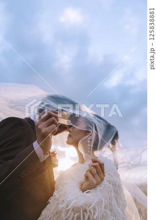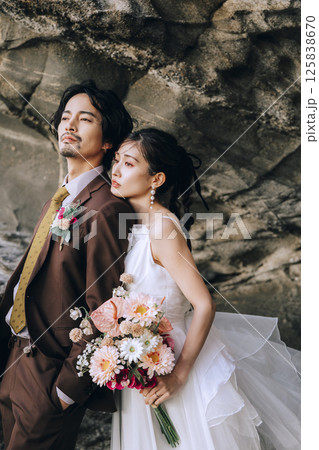 純白のドレスをまとい、ブーケを胸元に持って横たわる女性のイメージ写真