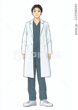 白衣と紺色のスクラブを着た若い男性医師のイラスト
