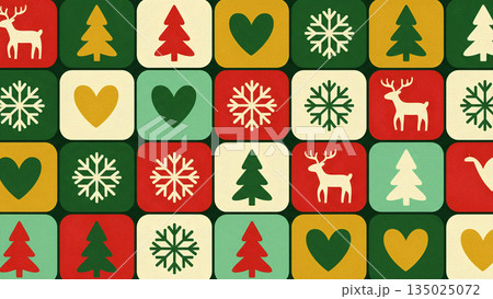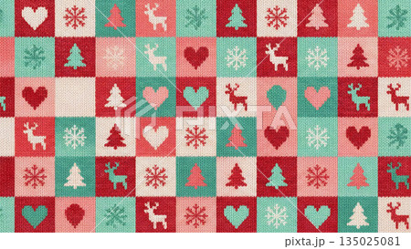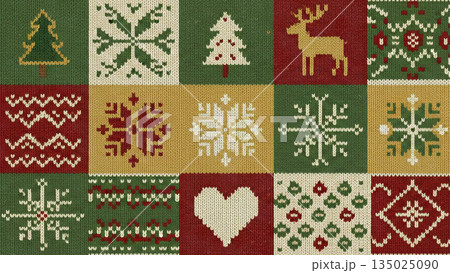 北欧風ニット模様の冬のデザイン。ざくざくとした編み目の質感 クリスマスの祝祭感と雪の結晶とトナカイ