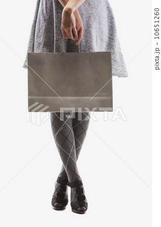Low section of young woman holding shopping bag, studio shot