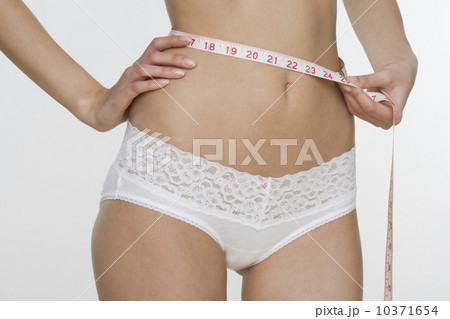 Close up of woman in underwear measuring waist