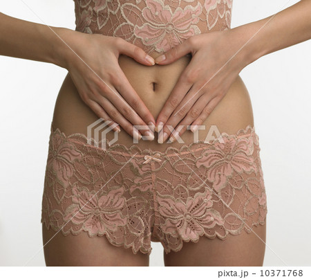 Woman in underwear making heart with hands on stomach