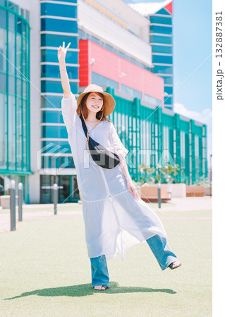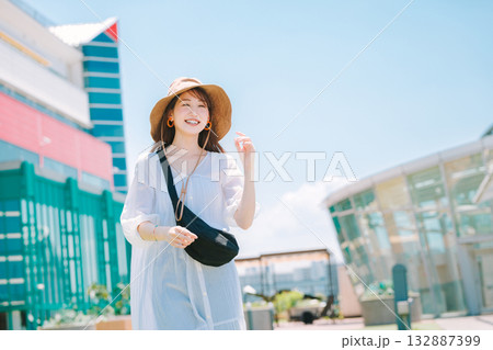 リゾート地で観光を楽しむ若い女性