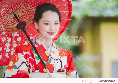 和傘を持った着物姿の若い女性