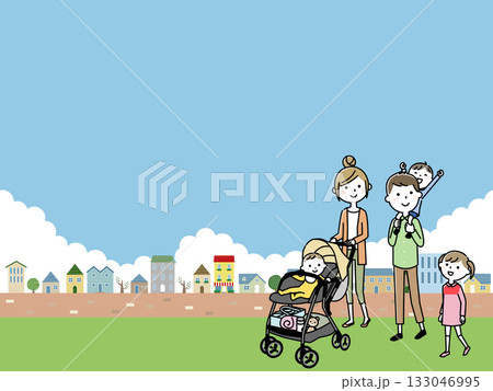 赤ちゃんとベビーカーでお出かけ中に階段を見上げるお父さんのイラスト素材