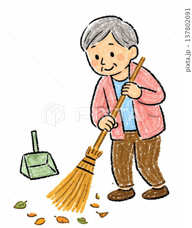 水色の作業着を着たシニア男性が、竹ぼうきを肩に担いで物思いにふけっているイラスト。