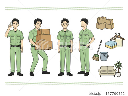 引越し作業スタッフと荷物・掃除道具のイラストセット(物流・引越し業)