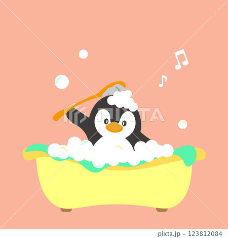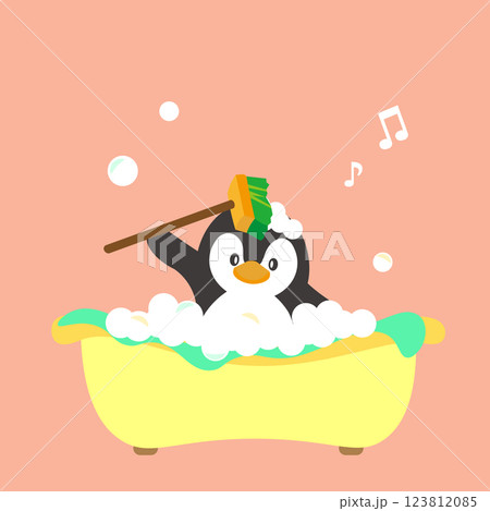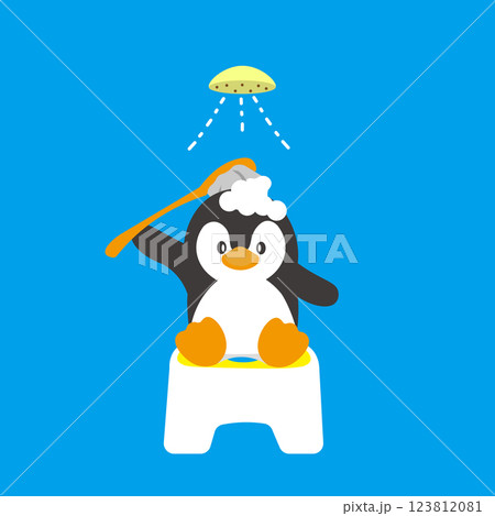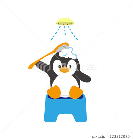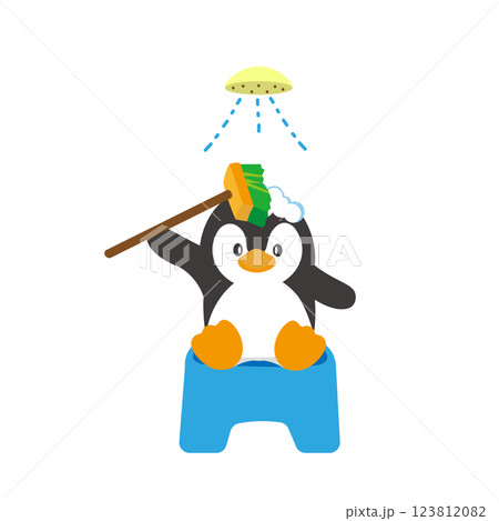 シャワーを浴びて、頭をブラシで洗うペンギンのイラスト