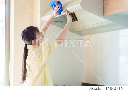 ほこり取り,ウールダスターで収納棚の埃を払う女性