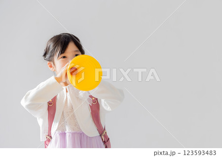 拡声器で叫ぶセーラー服を着た女子学生の切り抜き全身写真