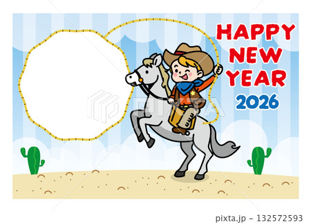 カウボーイの少年と縄のフォトフレーム年賀状イラスト(干支・西部風・明るい新年デザイン)