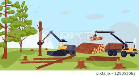 Logging machines cutting down trees. Destroying forest. Natural disaster. Stumps in desolate area. Nature ecosystem damage and deforestation. Environment conservation. Vector concept