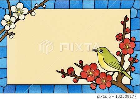 早春 梅とメジロ 紅梅 白梅 ステンドグラス調