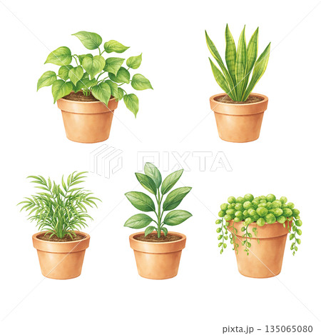 観葉植物の鉢植え 水彩風イラスト セット