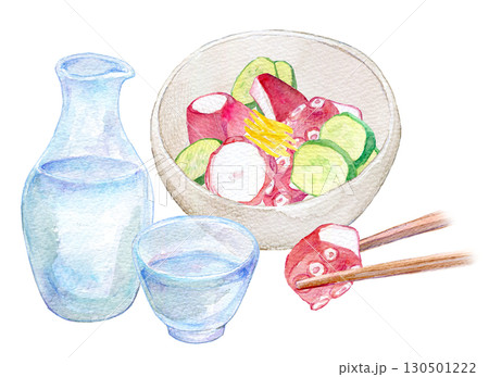 水彩イラスト 手描きイラスト 冷酒とタコの酢の物