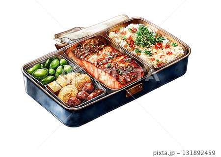 彩り豊かな幕の内弁当の水彩風イラスト