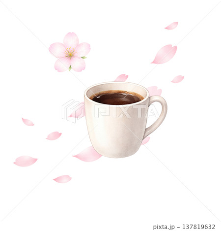 コーヒーカップと桜の花びら 春のカフェイメージ 水彩イラスト素材