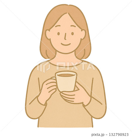 コーヒーを持つ女性のイラスト、 リラックスしてコーヒーを楽しむ女性、 カフェタイムを過ごす女性のシー
