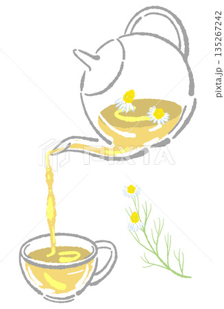 手書き風のガラスのハーブティーセットのイラスト(カモミール・ティーポット・カップ)