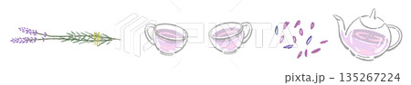 手書き風のガラスのハーブティーセットのイラスト(ラベンダー・ティーポット・カップ)