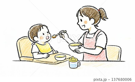 赤ちゃんに離乳食を食べさせる母親イラスト