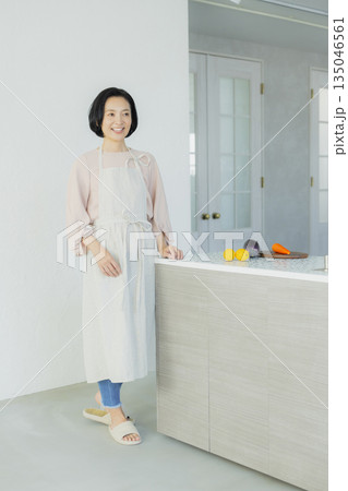 マイホームのキッチンで料理をするエプロン姿のシニア女性(苦手,嫌い,不得意,ストレス)