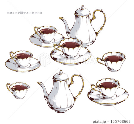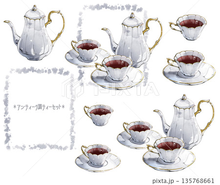 水彩で描いた白のエレガントなティーポットとティーカップのイラスト