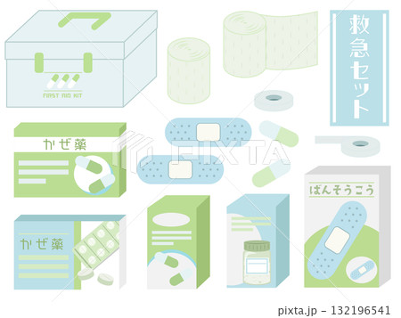 薬と包帯などの医療用品セットの可愛いイラスト