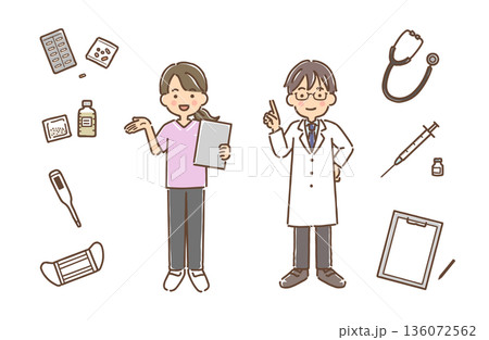 スクラブ姿の看護師・白衣の医師・医療アイテム/セット