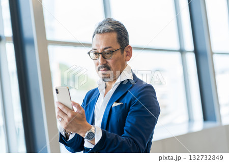 スマホを操作するミドル・シニアの男性。