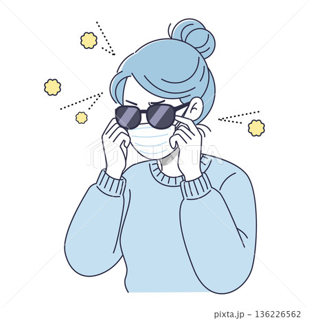 花粉症対策でマスクとサングラスをつける女性のイラスト