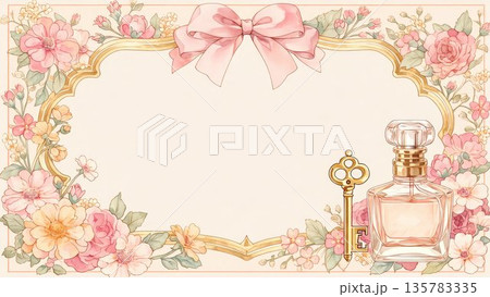 花とリボンで飾られた香水モチーフのヴィンテージフレーム