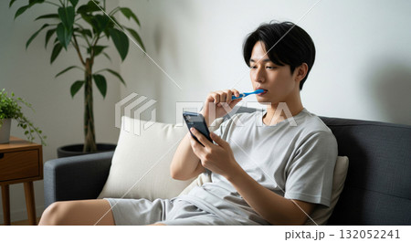 朝。ソファに座り、スマホを見ながら歯磨き