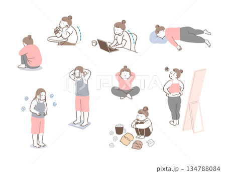 ぽっちゃり体型の女性のライフスタイルイラストセット