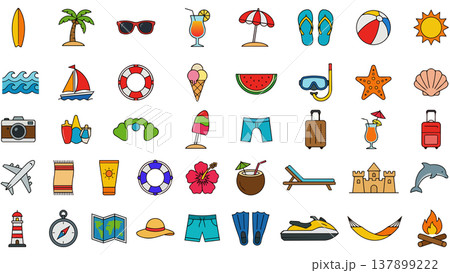 夏のビーチバカンスをテーマにしたカラフルなアイコンセットイラスト