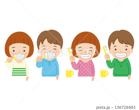 歯磨きできれいな歯の家族のイラスト
