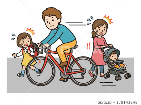 自転車が歩行者に接近する危険運転のイラスト(子供・ベビーカーとの接触リスク・交通事故)