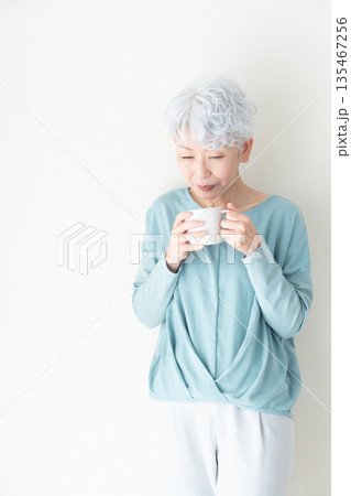 マグカップを持つシニア女性
