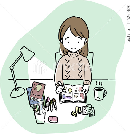 くすみカラーの日記帳セット/鍵とコーヒーのシンプルなデスクレイアウト(透過背景)