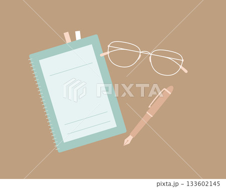 くすみカラーのステーショナリーセット/ノートと万年筆とメガネの勉強デスク(背景色あり)