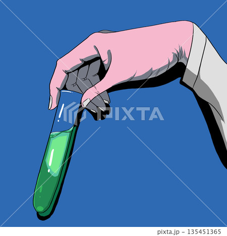 人工血液の入った試験管を手にした医療研究のアニメ風イラスト素材(接写)