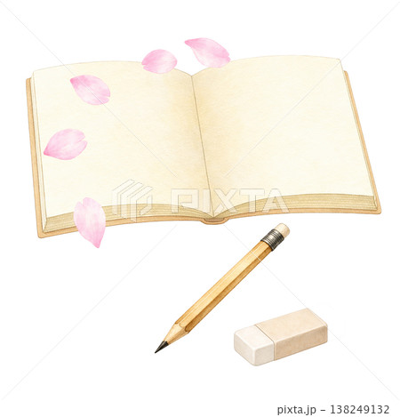 ノートと鉛筆と消しゴムのシンプル素材 学習と文房具の春イメージ 白背景