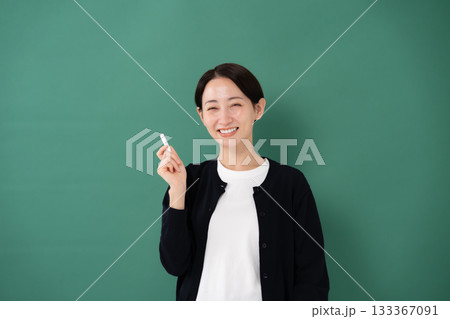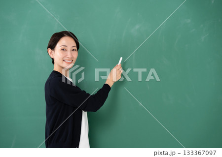 黒板の前で笑顔を見せる女性教師