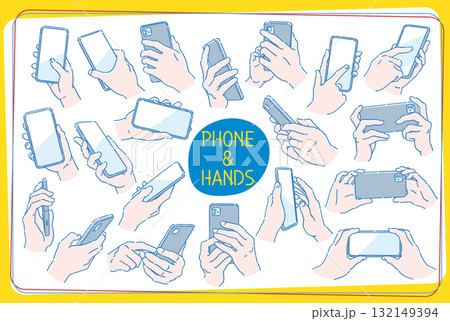 スマートフォンを持つ手のセット。ベクターイラスト素材。