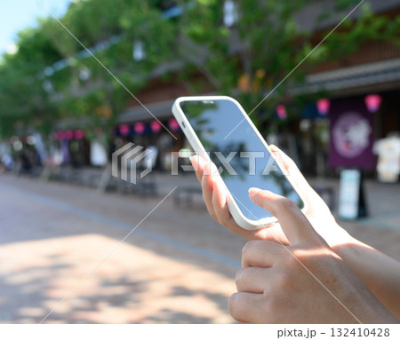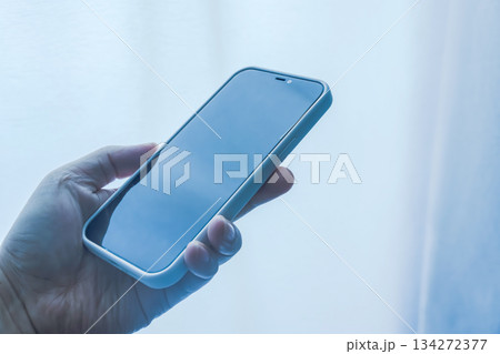 青みがかった自然光の中でスマートフォンを持つ男性の手元(上半身・クローズアップ)