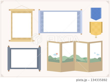 Vector illustrations of traditional Korean scrolls and folding screens.