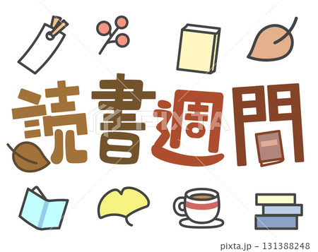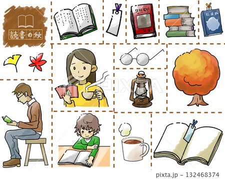 手描きテイストな秋の読書グッズのイラストセット(カラー・秋色01)