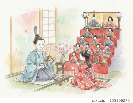 ひな祭りの水彩画イラスト 桃の節句の雛人形素材