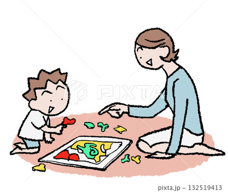 パズルをして考える子ども/教育・療育現場に使える手描き風イラスト