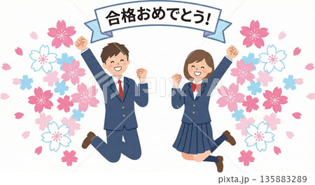 満開の桜の下で合格証書を持ち喜ぶ学生と祝福の紙吹雪 イラスト